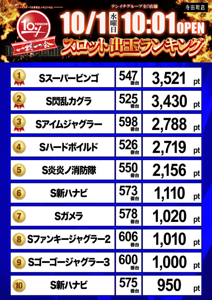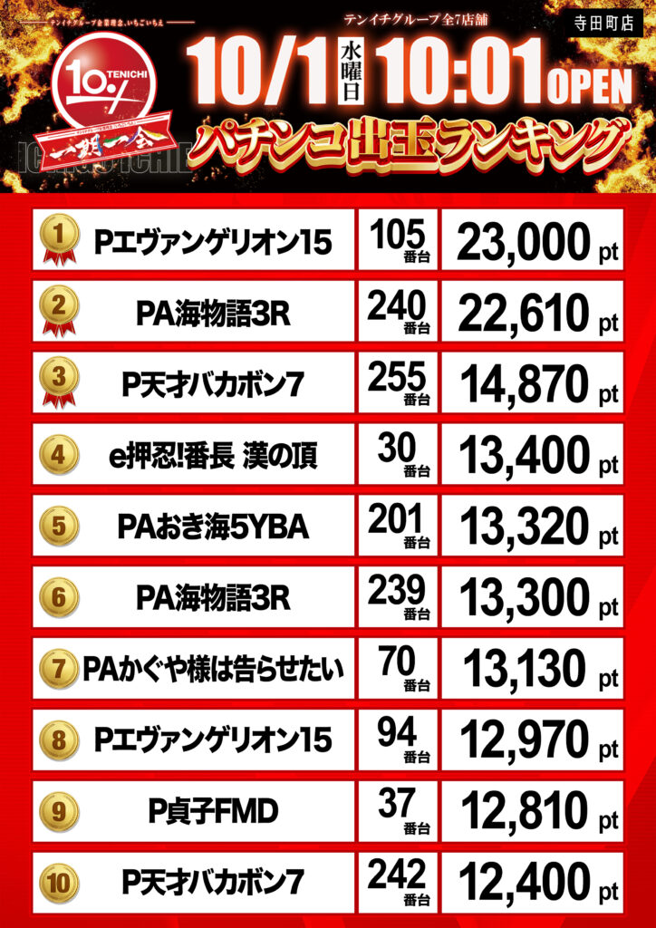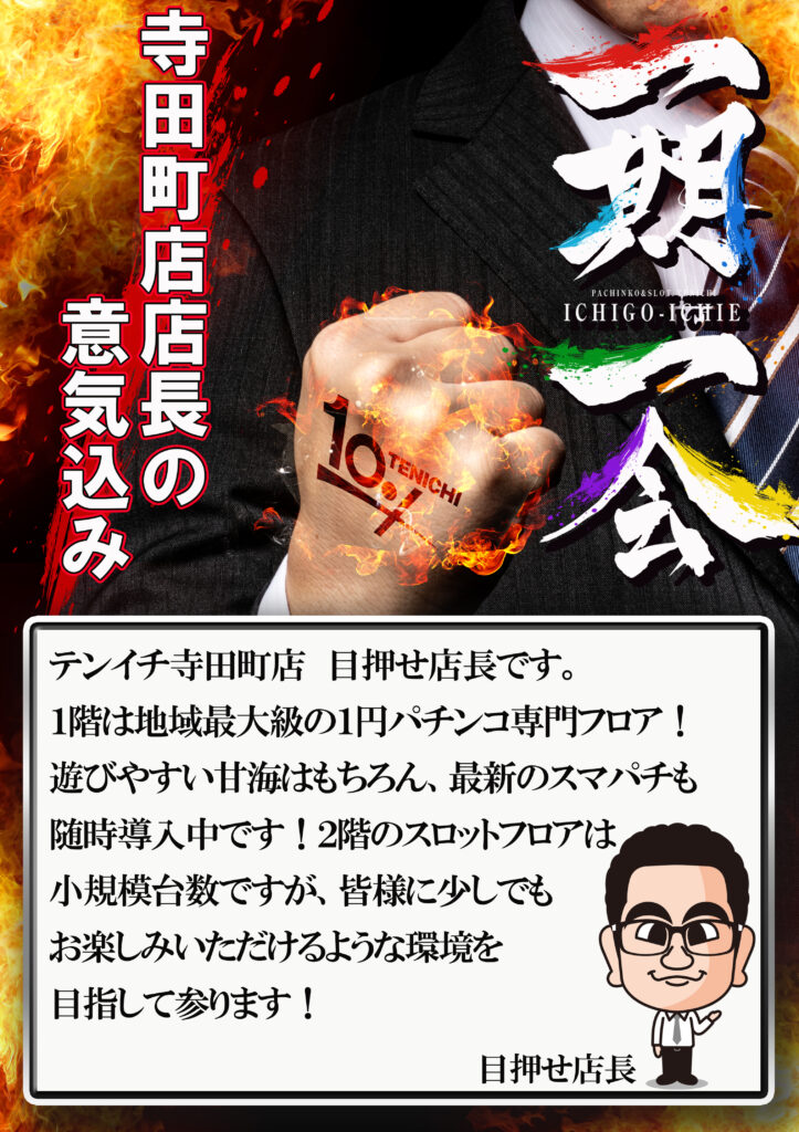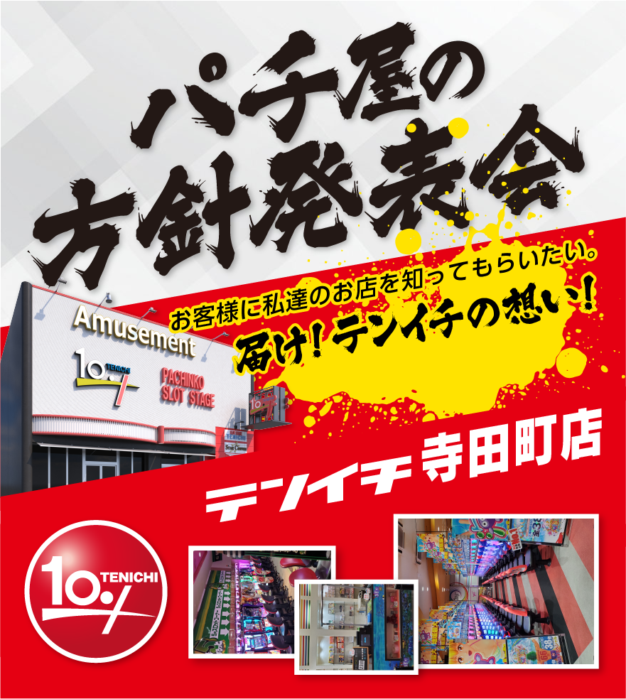 最新情報 テンイチグループでは能登半島地震被災地への支援活動を実施しています。 テンイチ寺田町のオススメ P大海物語4スペシャル 根強い圧倒的支持を誇る海シリーズの中でもP大海物語Eがオススメです。当店設置台数NO1!確変ループ。遊タイム付き。出玉はオール1,500発。なんでもないリーチから急に走る!!知れば知るほど【ラグーンモード】が楽しい!大泡時はSPリーチ発展願い、発展無くても±1コマずれ以外を祈りましょう! その他お店の情報はこちらから